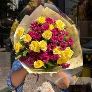 Bouquet Coloré de Roses Jaunes et Fleurs Violettes